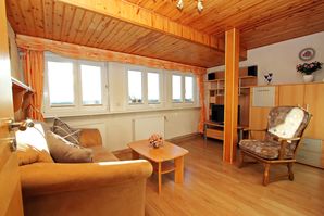 - Wohnzimmer mit Zweisitzer Couch, Couchtisch, Stuhl und einer großen Schrankwand mit TV