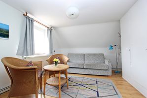 Die Wohnung Nr. 2 (für eine bis drei Personen) im Obergeschoß des Hauses ATLANTIS heißt Wohnung Dünenblick. Sie hat zwei Räume mit drei Schlafplätzen und ist freundlich und gemütlich. Sie ist ausgestattet mit einer Kochnische und einem kleinen Duschbad. Der Blick aus den Fenstern geht nach Osten auf die Dünenkette auf der Wattseite der Insel. Die Wohnfläche beträgt ca 27 qm.