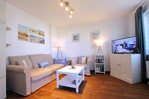 modernes 1 Zimmer Appartement mit ca. 32m² unweit des Hörnumer Golfplatzes; ein Wohn-/Schlafraum mit Doppelschrankbett, Zweisitzer-Couch, 2 Sessel, Tisch, Kommode, Schrank, Sat-TV, Radio mit CD-Player, Zugang zum Westbalkon mit Bestuhlung; kleine separate Pantryküche mit neuem Cerankochfeld (2 Platten), neuer Dunstabzugshaube, Mikrowelle und neuem Kühlschrank mit Gefrierfach; Esstisch für 2 Personen; Flur mit Garderobe und Abstellkammer; neues Duschbad/WC.