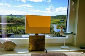 modernes 2 Zimmer Appartement mit ca. 48 m² über OG/DG in Hörnum-Nord; Im OG befindet sich ein Wohnraum mit einem Ecksofa, Tisch, Internet-Radio incl. CD-Funktion, Smart-TV, Glas-Esstisch mit 4 Stühlen im skandinavischen Design, Sideboard mit Mikrowelle, einer Nespresso-Kapselmaschine und Senseo Kaffeepadmaschine, Zugang zum Südbalkon mit Balkonmöbel von dem aus Sie einen fantastischen Blick Richtung Golfplatz und Leuchtturm haben. Separate Küche mit 2 Plattenherd, Kühlschrank sowie einen Eierkocher. Duschbad/WC mit Schminkspiegel. Flur mit Garderobe über den eine Wendeltreppe ins DG führt. Dort befindet sich ein Schlafraum mit Doppelbett (zwei einzelne Matratzen), Nachttisch, Sideboard mit kleinem TV und ein Kleiderschrank. Kostenloser Internetzugang via WLAN.